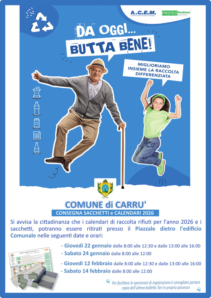 Si avvisa la cittadinanza che i calendari per la raccolta rifiuti per l'anno 2026 e i sacchetti potranno essere ritirati nel cortile del Municipio nelle seguenti date: